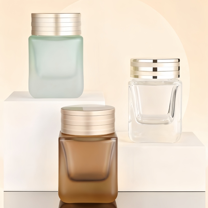 The 60-gram square thick-bottomed frosted glass cosmetic jar is highly suitable for storing and distributing face cream, eye cream and facial masks. The jar lid is equipped with a hand pull pad, which is particularly convenient for ensuring the safety of the products during transportation.